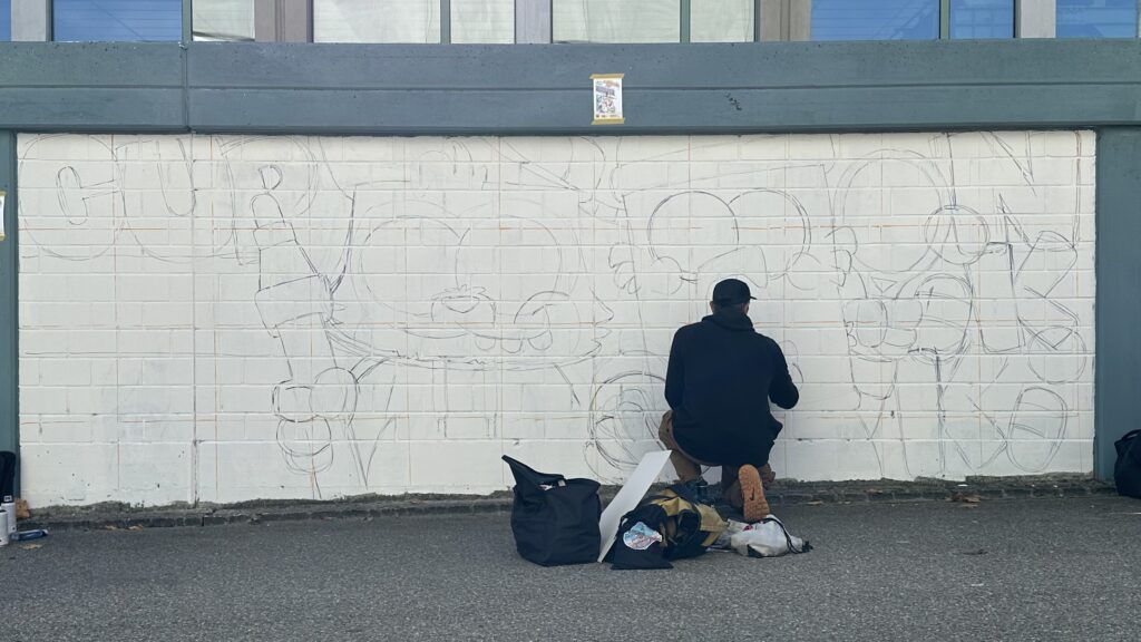 Das Ganze erhält später noch eine Farbspritze. Auf seinem Handy zeigt «Brainfart», wie das Wandbild am Ende aussehen soll: links der Künstler (als Comic-Charakter) mit seinem Stift in der Hand, rechts Nikki (ebenfalls als Comic-Charakter) mit einem Tennisschläger. Im Vorgespräch, das alle Künstler mit den Bewohnern führten, erfuhr er, dass das eine frühere Leidenschaft von Nikki war.