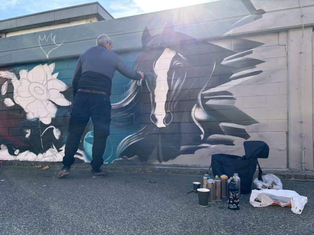 Fährt man von der Bahnhofseite auf die Werkhofstrasse ein, so bleibt der Blick rasch am Wandbild von Sandro* und dem Wiler Künstler Alexander Huwyler hängen. Ein schwarzes Pferd mit weisser Blesse schaut auf die Strasse, sein Fell scheint in der Sonne zu glänzen. Gerade tätigt Huwyler den Feinschliff an der prächtigen Mähne. Am Bild fällt noch mehr auf: eine durchbrochene Mauer, zersplittertes Glas und Blumen.