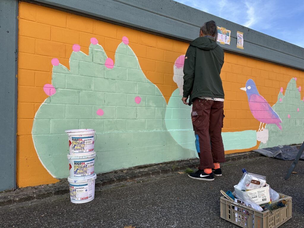 Das Wandbild von Manuel und Tiziani ist noch nicht ganz fertig. Am linken und rechten Rand des Bilds sind Umrisse von Blumen erkennbar. Neben den Wölfen mag Manuel nämlich auch Pflanzen, wie der Bewohner Tiziani im Vorgespräch erzählte. Die Pflanzen würden ihn an Zeiten in seiner Kindheit erinnern, die er im Garten seiner Grossmutter verbrachte.