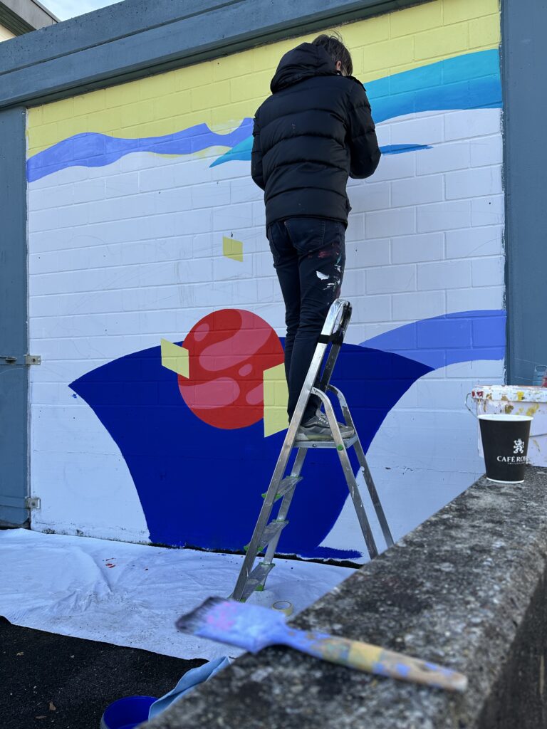 Cup of Color arbeitet nicht das erste Mal mit dem Haus Otmar. Das erste gemeinsame Projekt realisierten sie 2021. Im Wohnheim zieren bereits vier Kunstwerke die Wände. Auch dabei konnten sich die Bewohner einbringen – zwei der Bilder enthalten Hinweise darauf, was Nicolas wichtig ist. Das Pi-Zeichen deutet darauf hin, dass er sich für Mathematik interessiert, die Füllfeder, dass er gerne schreibt.